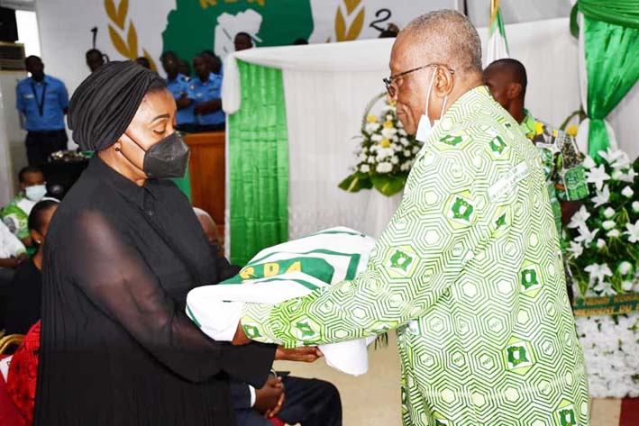 A la suite de l’oraison funèbre, l’on a procédé à la remise du drapeau du Pdci-Rda à la veuve du Premier ministre Banny. Ce sont mesdames Adèle N’dioré et Amy Diop qui ont d’abord remis ledit drapeau au vice-président Georges Philippe Ezaley, qui l’a ensuite remis à l’épouse de Charles Konan Banny avec des mots de compassion. Puis, Aminata Diop a ensuite remis 50 roses blanches à la veuve de la part du président Henri Konan Bédié.